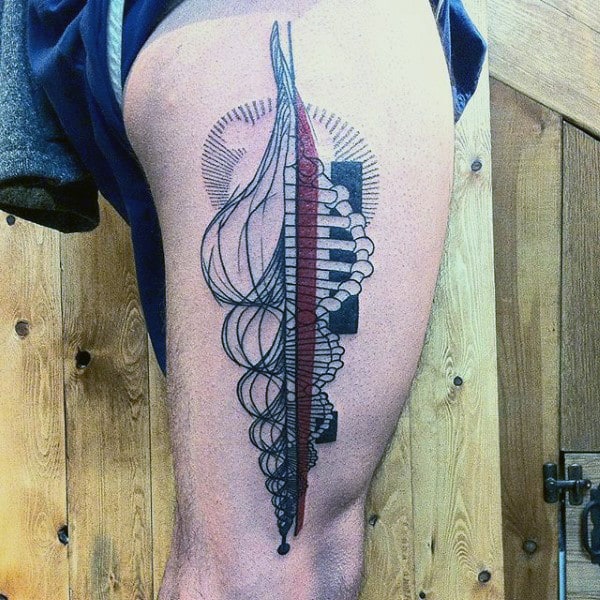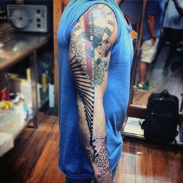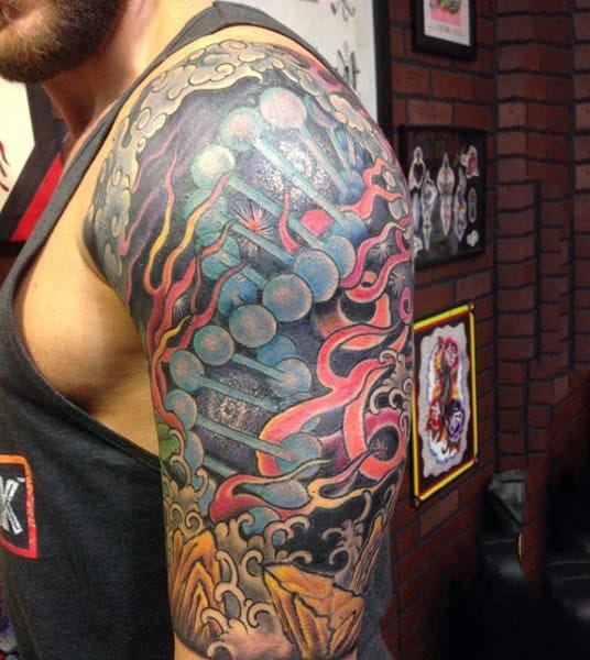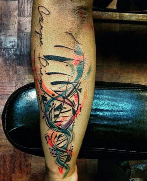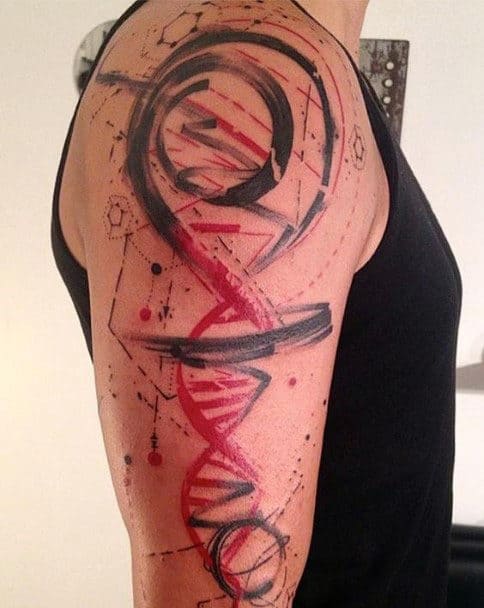 The beauty of DNA doesn’t have to be literally depicted. For a more artistic or covert nod to the marvels of nature, talk to your artist about abstract DNA tattoos. With a watercolor style your tattoo may even resemble works of modern art. Or try a full sleeve like the fifth piece shown, which hovers between a ladder to time and geometric patterns with an abstract DNA tattoo in between.