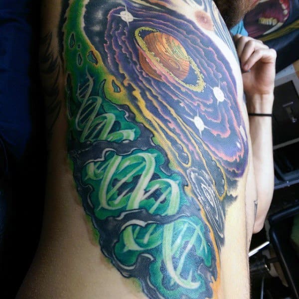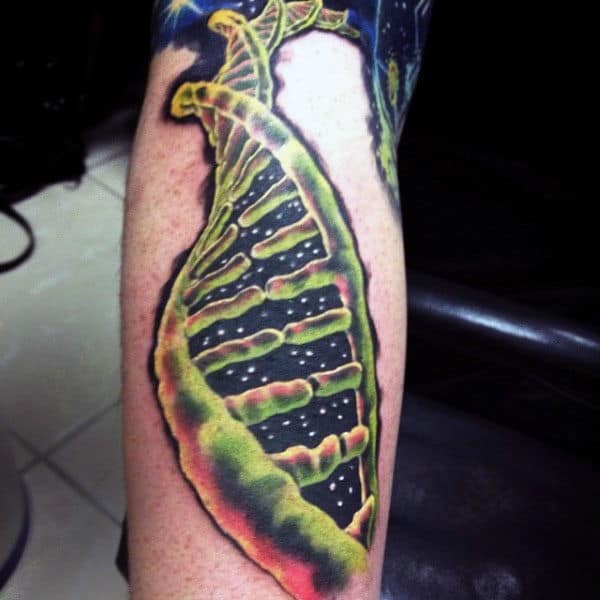 And technically, we can’t confirm that DNA didn’t come from space so feel free to give your space DNA tattoo an otherworldly feel like the fourth piece. The shading of the mutant green helix contrasts impeccably with the inner star-speckled filler.