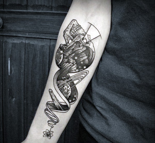 Blend the micro and the macro together with a stellar space DNA tattoo. Absorb a galaxy into the DNA helix or grow a star from the strands. As all of these examples show, this is a great opportunity to get creative with your color palette like the second and third pieces shown.I’m a big fan of the shadowing of the DNA molecules in the third piece, especially as the molecules begin breaking apart in the foreground. The whole piece balances really well despite the seemingly contrasting colors.