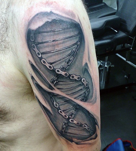You may have encountered torn skin tattoos before, but pairing it with DNA takes it to microscopic levels. A torn skin DNA tattoo uses negative space to convey skin that is coming apart at the seams to reveal the fundamental building blocks of DNA underneath. The third piece really takes the detail of the piece to another level with the muscles and the shadows of the DNA bulging underneath.