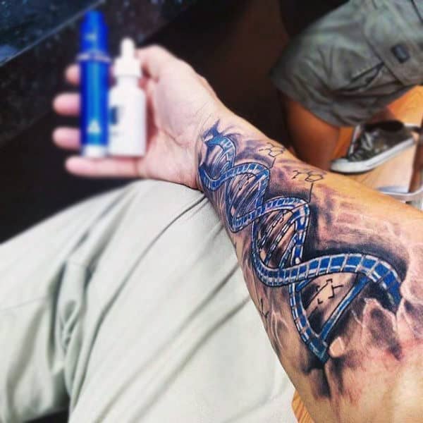 Most DNA ink includes some iteration of the double-helix structure. All of the chromosomes are available for depiction, and the comprehensiveness depends directly on personal inclinations. Colors are not typically required for these tats, so guys can get stellar black-and-white artwork with no hassle or commitment to multiple sessions. As an alternative, some wise fellows get the code itself in-scripted.