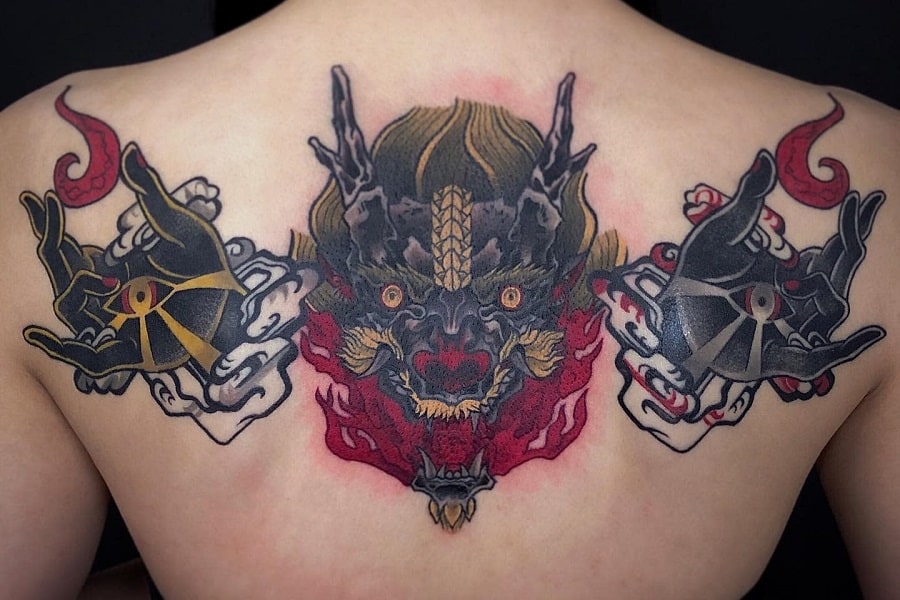 Back tattoo featuring a detailed, stylized dragon head with a flowing mane and intricate scales