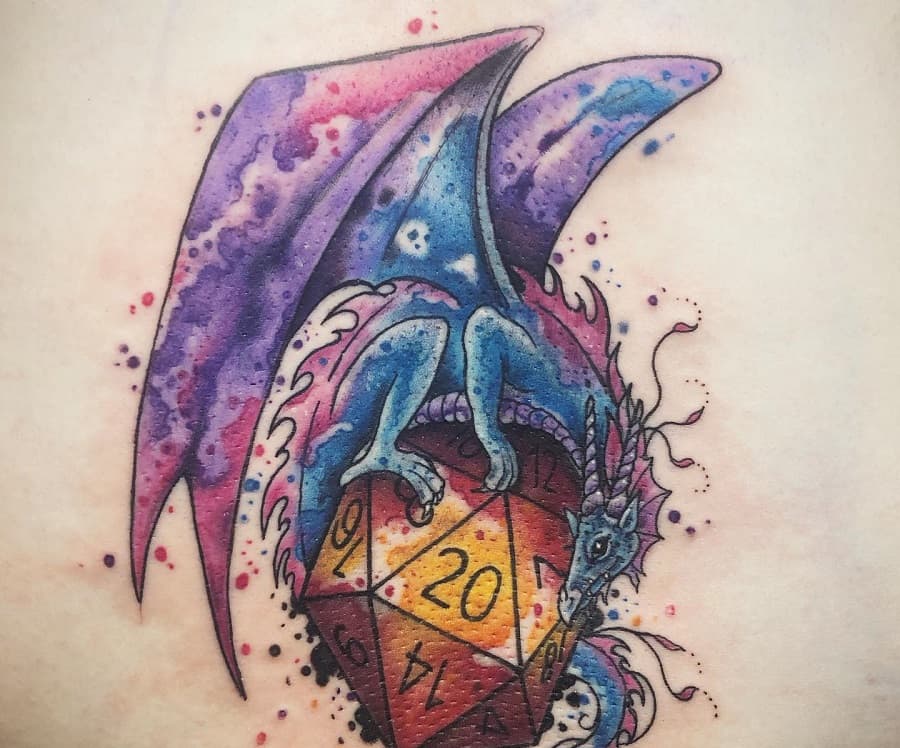 Watercolor-style tattoo of a blue dragon clutching a glowing orange D20 dice, surrounded by splashes of vibrant purple and pink