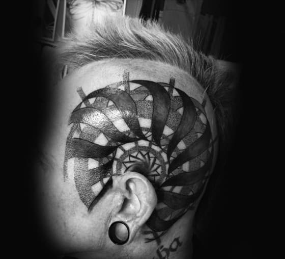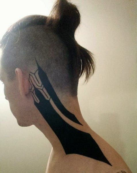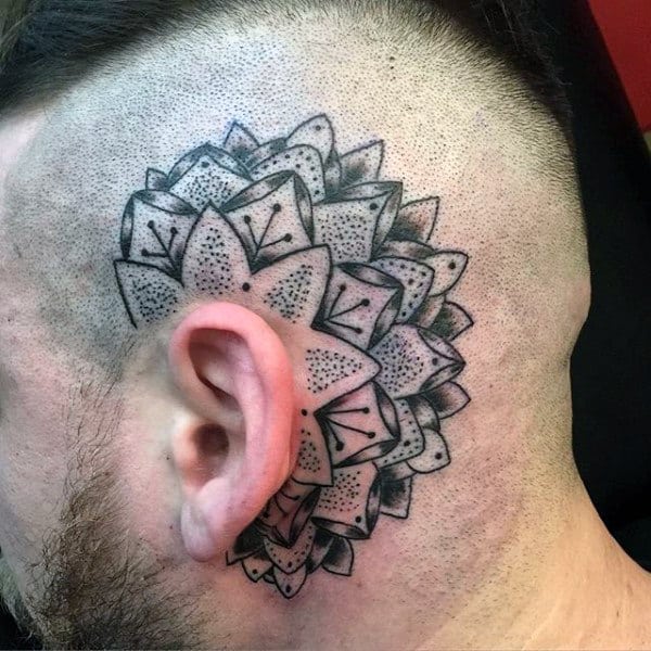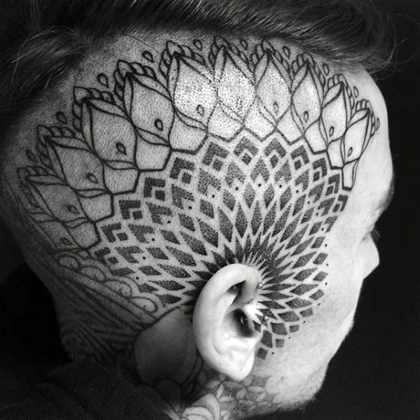 The pieces we observe are the mainly geometric style with an abstract flair, applying the use of a multitude of shapes that spread out evenly and beautifully like a mandala. Others go all out with a specific image, like the one outline what appears to be a heavily shaded eagle that moves from the sides of the skull to the back of the neck. Another appears Tribal with pure black ink spreading down the neck to the shoulder, beginning with the geometric line just behind the ear.