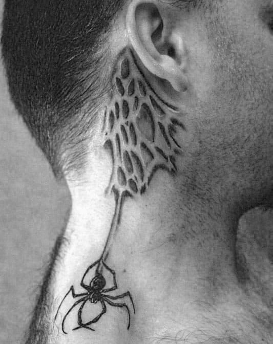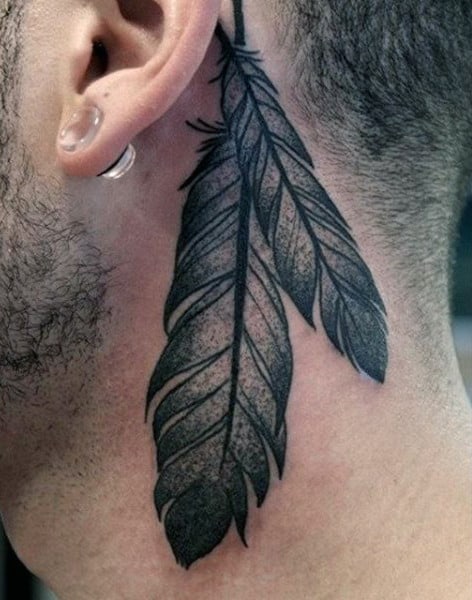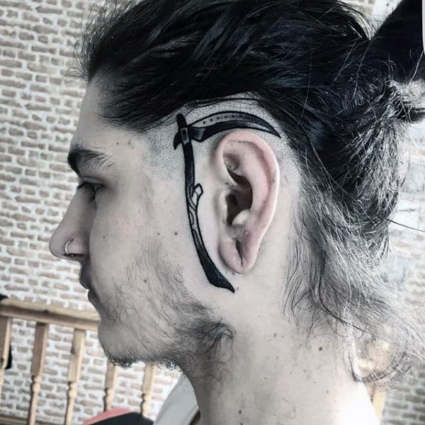 Some people get tattoos just outside the ear, which could be on the cheek, the jaw, or beginning of the side neck. Once again, the shape of the ear is utilized on the back of the neck, the piece somewhat more subtle and hidden, while pieces closer to the face tend to be more noticeable. Many opt for simple work; straight simple lines just before the beginning of sideburns, while others go full out with bold sword-like images running up the cheek to the lobe.