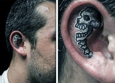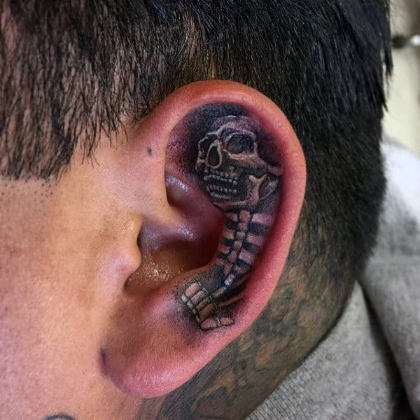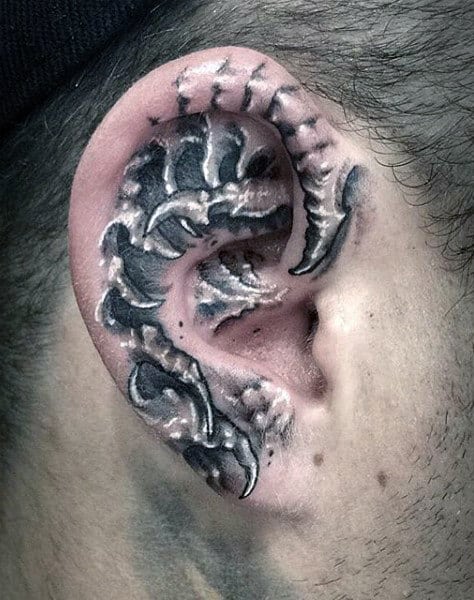 That is why, if your artist is knowledgeable, most detailed ear tattooed will utilize the shape of the ear and coordinate it with the image desired. In this section, we see multiple skull pieces—intensely detailed but huddled within the corner of the lobe or the spine image moving down the ears curve. These pieces are an incredible example of talented and innovative artists.