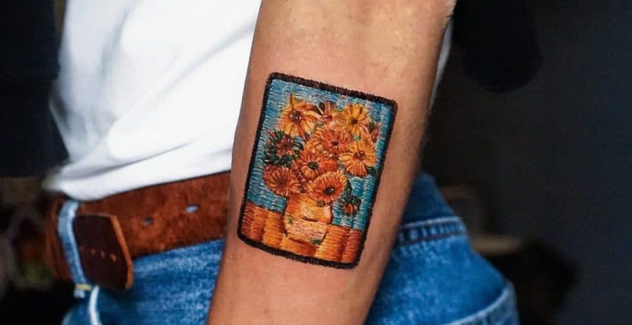 Patch-like embroidery tattoo of a sunflower bouquet in a vase, with intricate stitching effects for a 3D textile look.