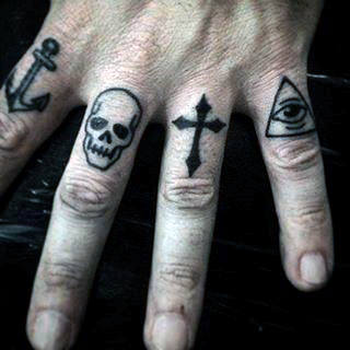 Bold, solid black ink lines are the best body art for this style, either fine or even thicker if the design merits it. The key is a clean design without a lot of extraneous detail, so the tattoo is easy to read and punched in with clarity to the inner finger or knuckle.
