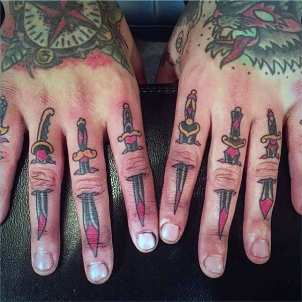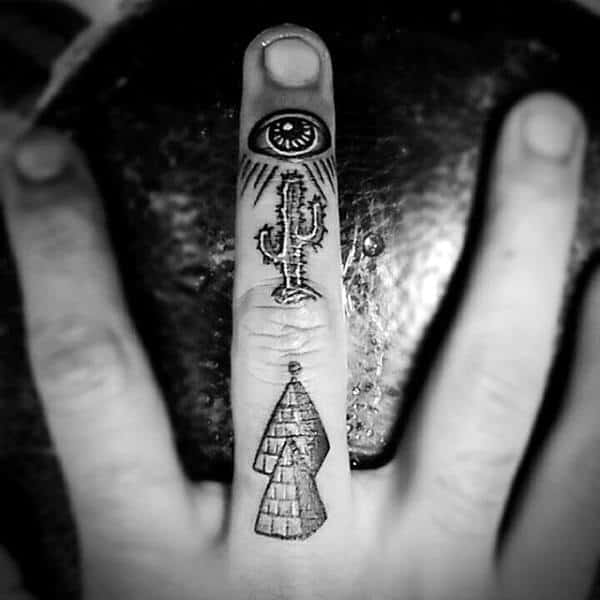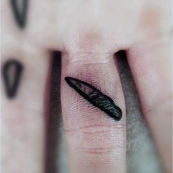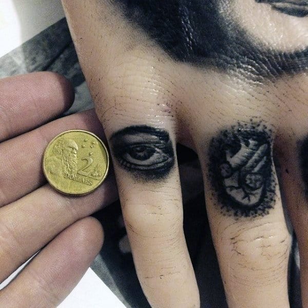 Thanks to the limited space available, using a variety of small symbols is well suited to finger tattoos. These tiny tattoos do not require extensive detail, white ink accents, or shading, which is ideal for the limited space and difficult skin that an artist needs to navigate when creating a finger tat. At the same time, small symbols like eyes and knives make for very eye-catching tiny tattoos in this location.