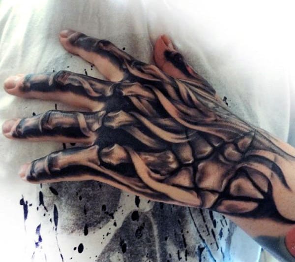 Some of the most intricate and detailed finger tattoos are those that continue up the hand to make a larger, more dynamic tattoo art. These tattoos make greater use of space by treating the fingers, thumb, and hand as one solid canvas rather than separate pieces, allowing for larger hand tattoos. They can also feature tattoo inspiration which exploits the unique anatomy of the hand , such as ones that present the skeletal structure of the whole hand.