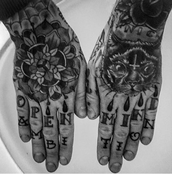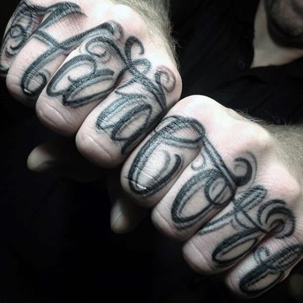 Any four-letter words will fit but so too will eight-letter words across both hands and even across the insides of your hands. The Inner finger tattoos in script style can range from simple, flowing handwriting to bold, blocky letters to something more ornate.