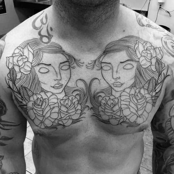 The second image is a line work chest piece. The hair of the twins and the roses are form fitting choices around the chest muscle. An addition of color would be recommended to make the tattoo stand out.