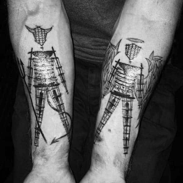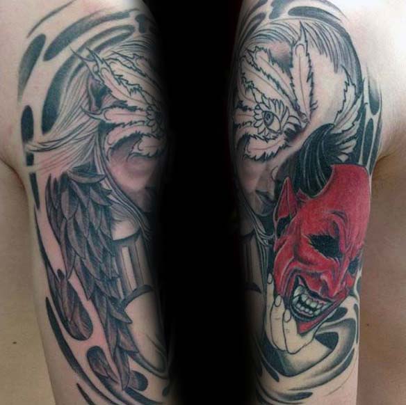 The fifth tattoo interprets this as having the balance of good and evil. Thick black line wok and geometric shapes gave birth to a devil and angel. These two images being on separate forearms is a perfect example of creative placement. While image four interprets “the duality” as a mask. This devil mask seems to be inspired by the Hannya style. Hannya is a Japanese style of tattooing a devil mask, cartoonish in its features, and often done in color. The rest of the tattoo is done with black line work and dark shading.