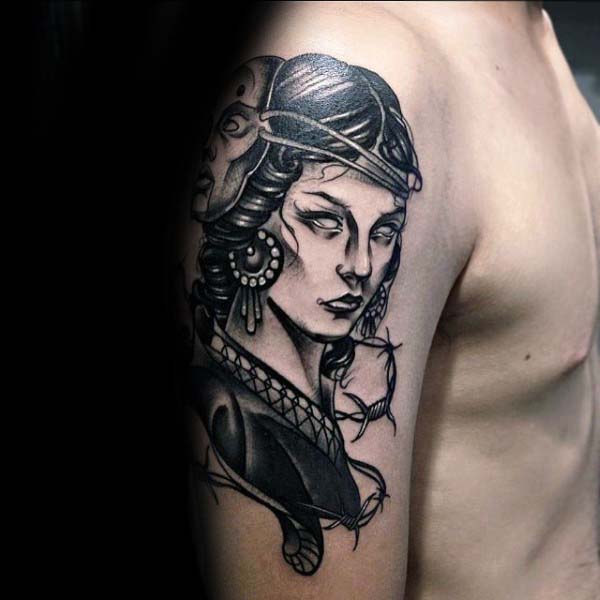 A Neo Traditional style portrait done in black and grey is a favorite amongst many tattoo enthusiasts. Notice the addition of white highlight on the face, this adds a subtle duality of warmth to the black coloring.