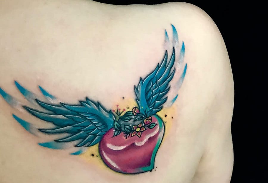 Heart with wings tattoo in shades of blue, pink, and red adorns the person's upper back