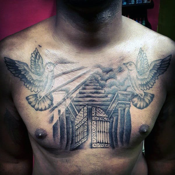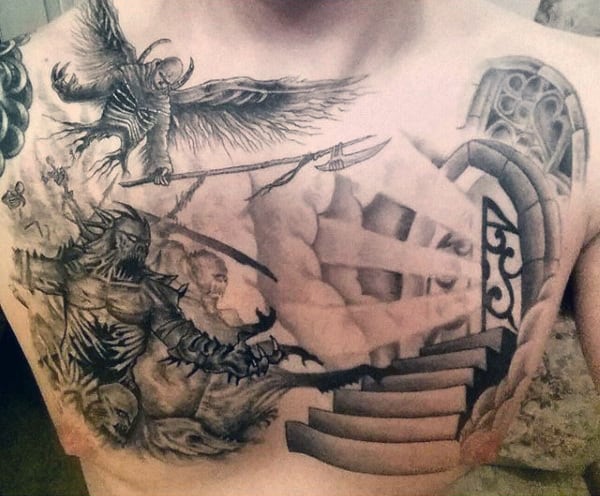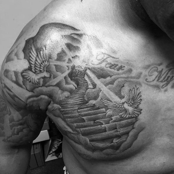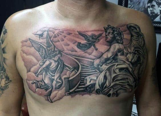 Ideas so grand that they can’t be contained on a sleeve are great options for a Heaven tattoo on the chest. The look of a chest piece which extends down the arm works for virtually any design with two or more central themes.