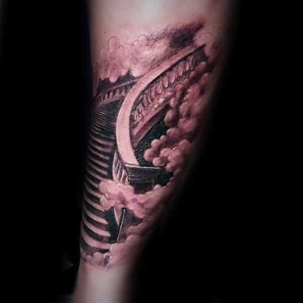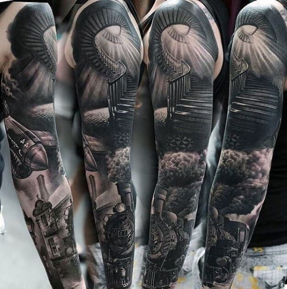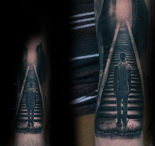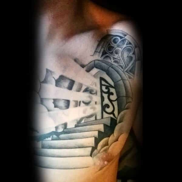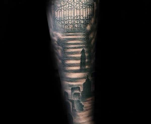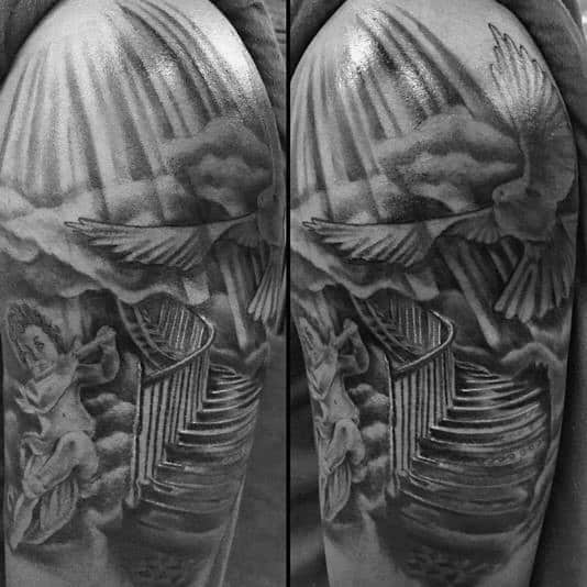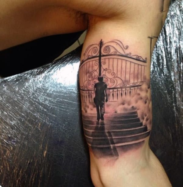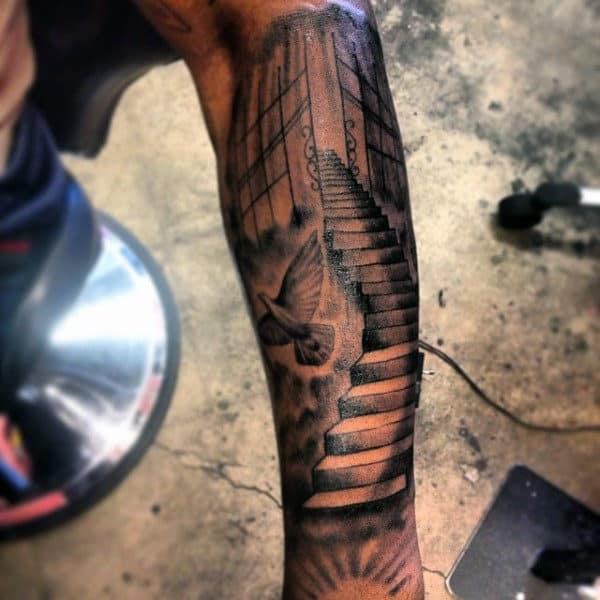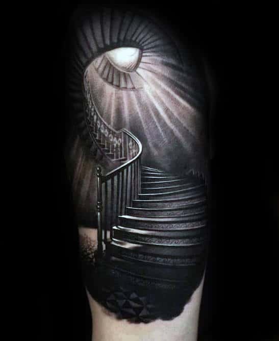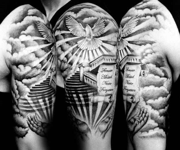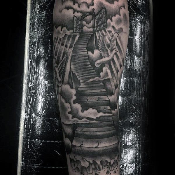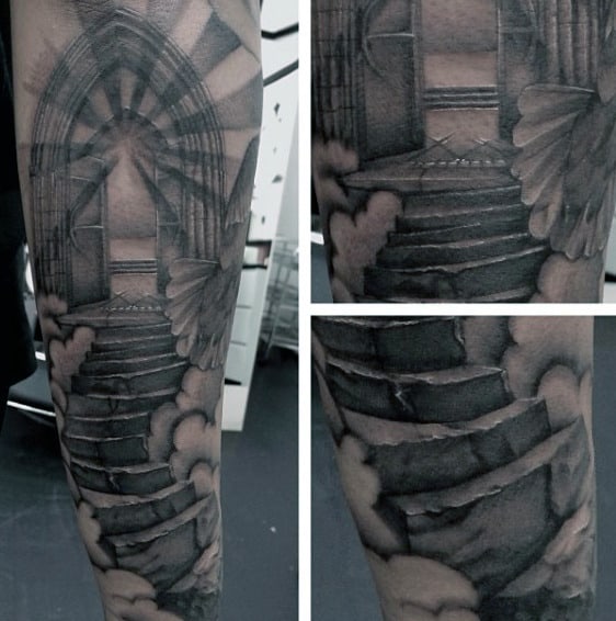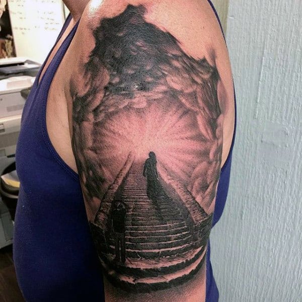 However you approach the idea, it’s a classic and beautiful interpretation of the journey to Heaven. Your staircase may be shimmering to depict Heaven itself, or cracked and rickety, to describe your own journey. Staircases are also a sneaky way to fit Heaven tattoo quotes into the mix – try using the stairs’ risers as a backdrop for lyrics, poetry or just about any text which complements your design.