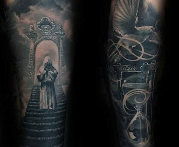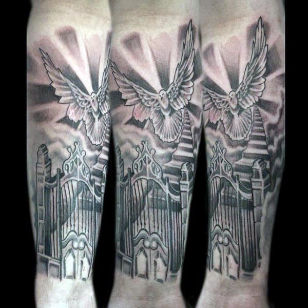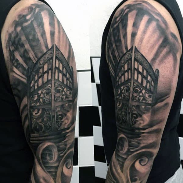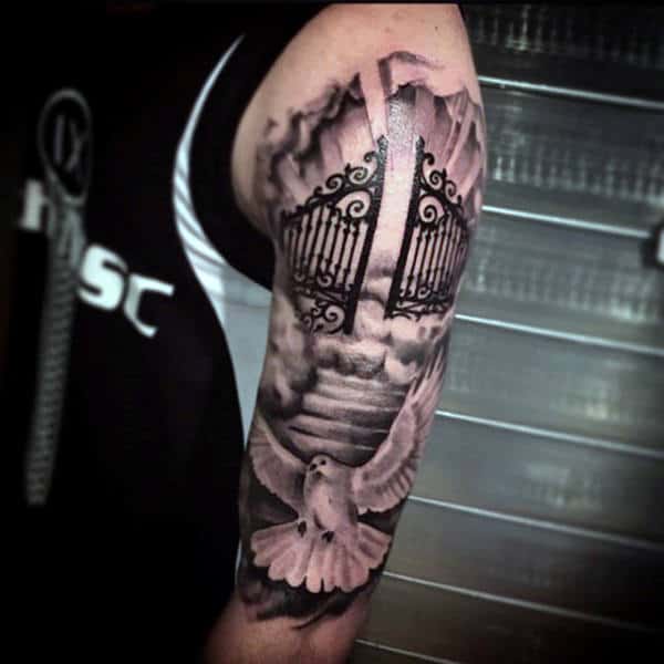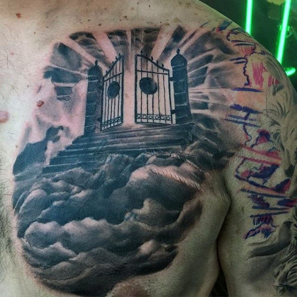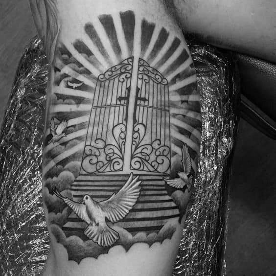 St. Peter opening the pearly gates is an extremely familiar visual when it comes to Heaven. Whether you picture a saint or not, the image of Heaven having gates goes back thousands of years. They may be grand and made of solid gold, or they might be rickety and look more like the back gate of the farm where you grew up. Personalizing your gates goes a long way toward creating a Heaven tattoo design that’s true to you.
