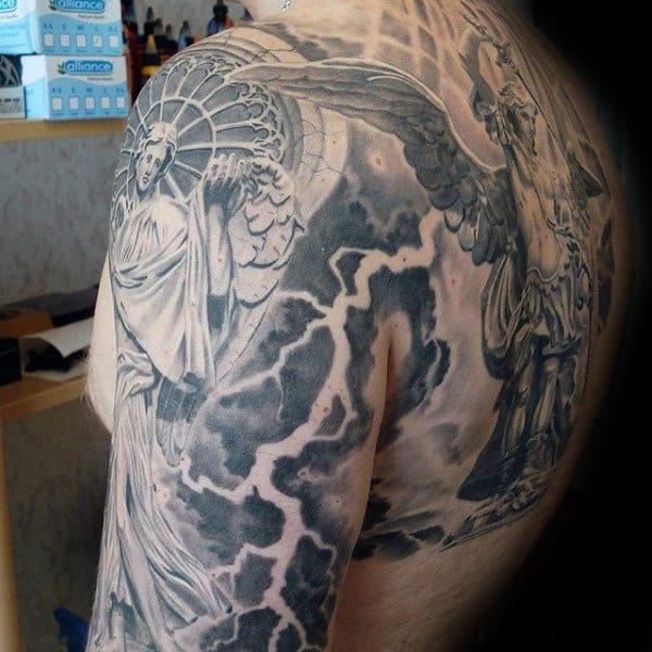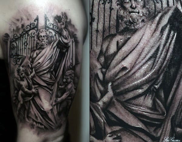 If you want to balance your heavenly tattoo with its’ darker counterpart, consider this exceptionally gorgeous Heaven & Hell pair of upper sleeves. Crucifixes, saints and Heaven are contrasted with tortured souls damned for all eternity. This pair works due to skillful linework, expert shading and a great sense of proportion.