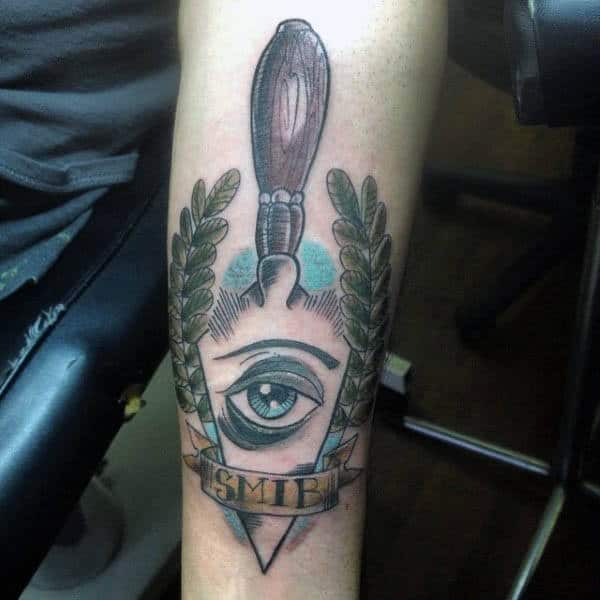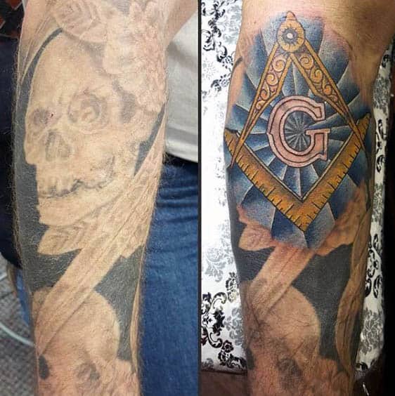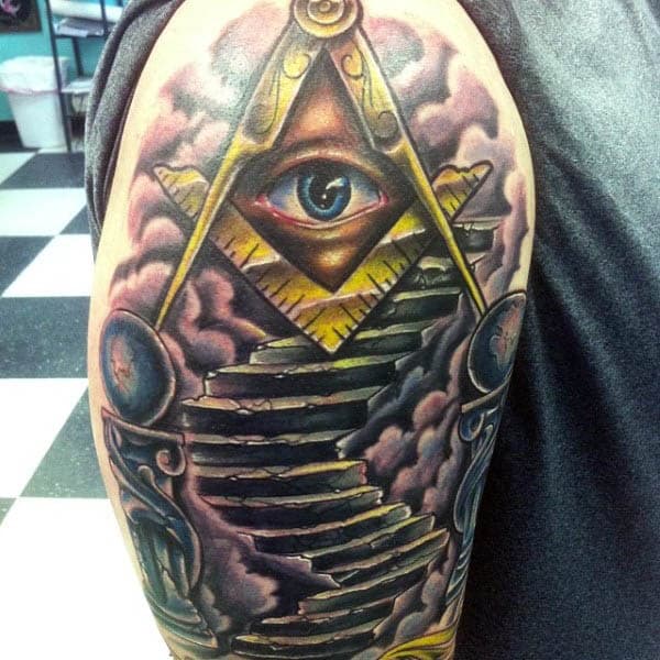 The most common use of images is the all-seeing eye, the alter of freemasonry, the compass usually with the letter G, and the masonic gavel. Most have some kind of scene to rely on that is historically relevant, such as a scene of a temple and/or stairs leading to various clouds in the sky. Others are more abstract and contain skulls, blending into a big section of skin that looks more personal than classically masonic.