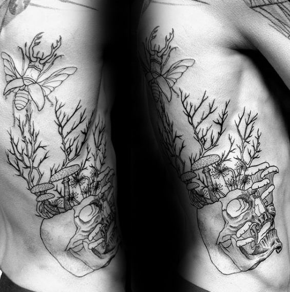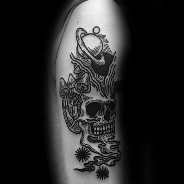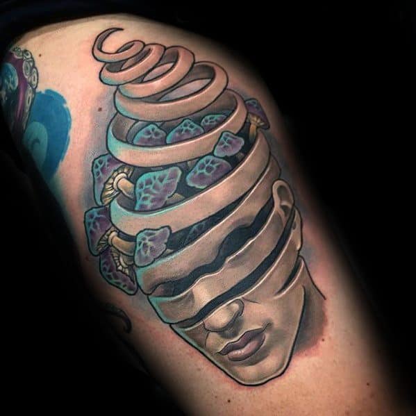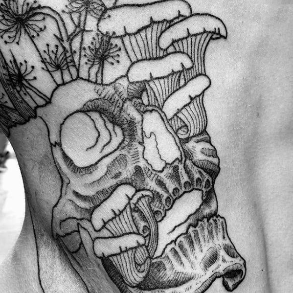 On the other end of the spectrum, include a skull with your mushroom tattoo accent the deterioration and decay that fungi inhabit. The empty spaces of a skull make for the perfect framework out of which your mushrooms can blossom out of.