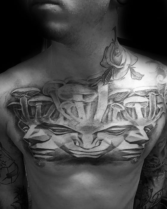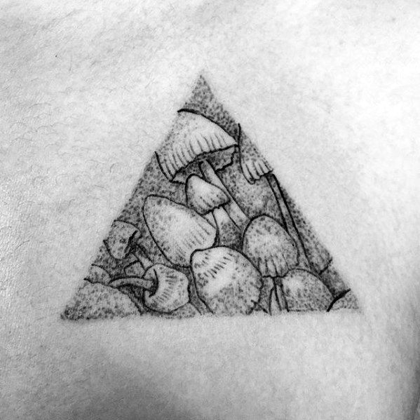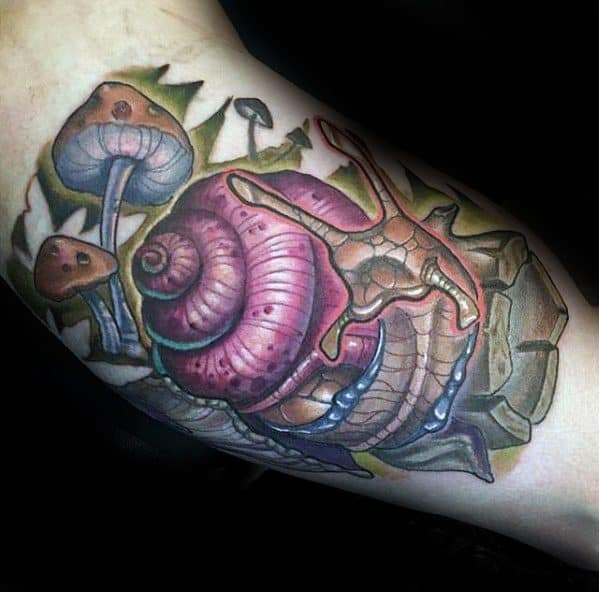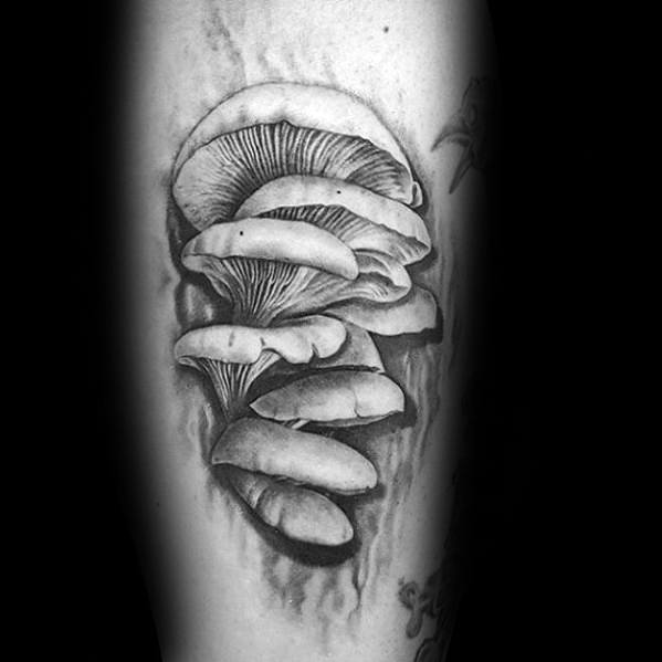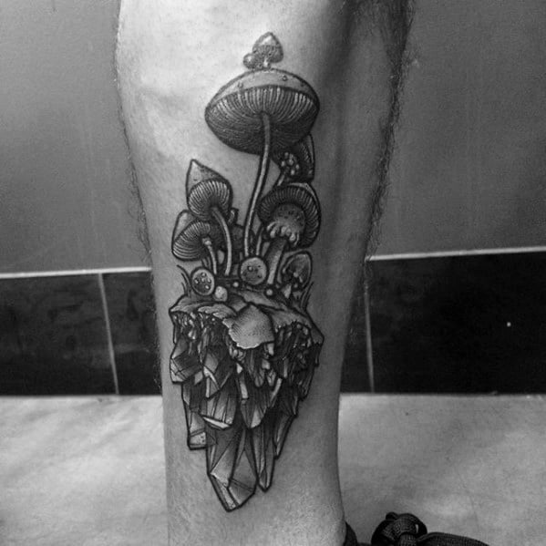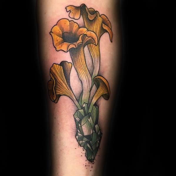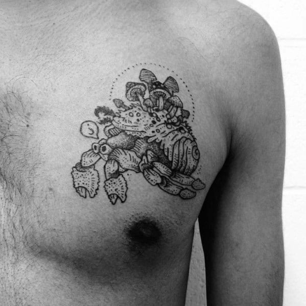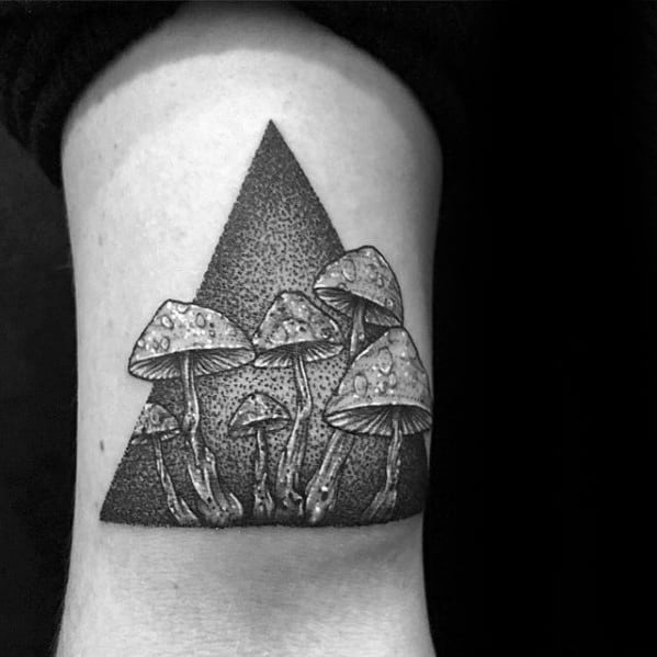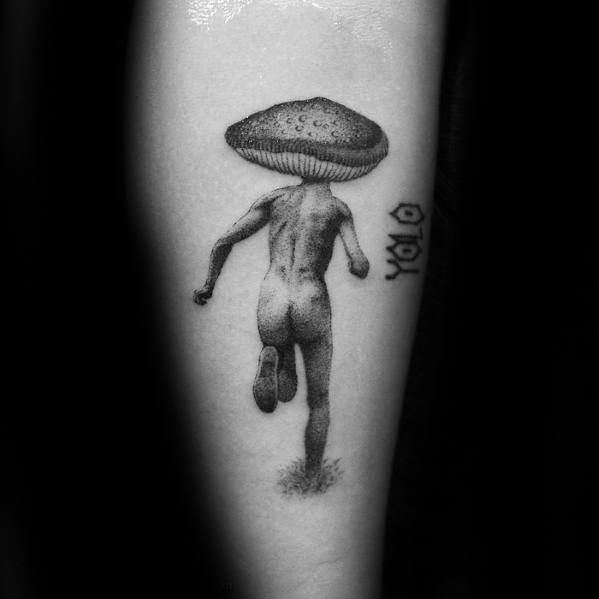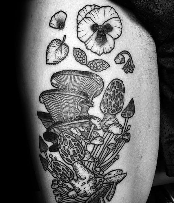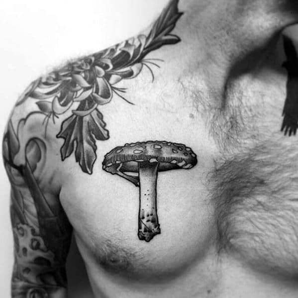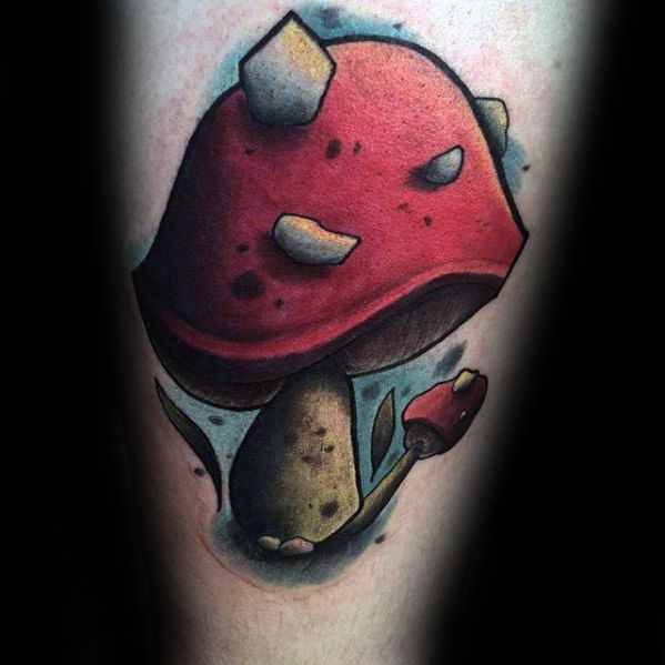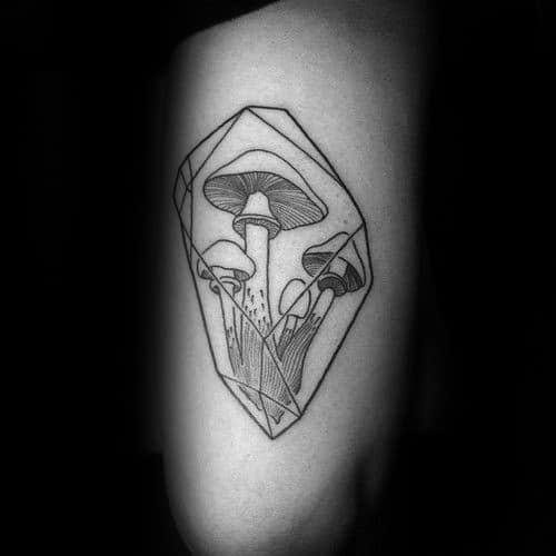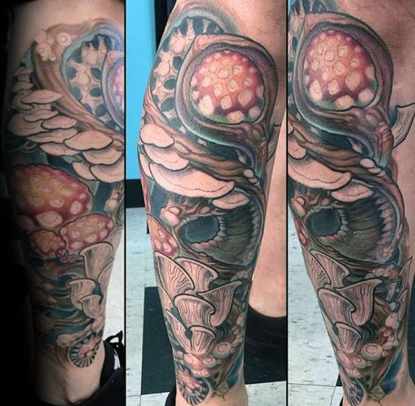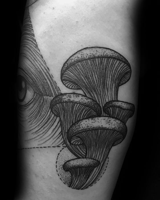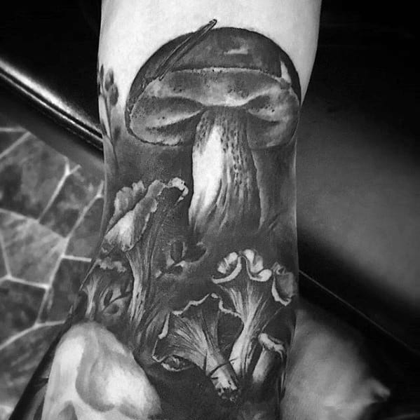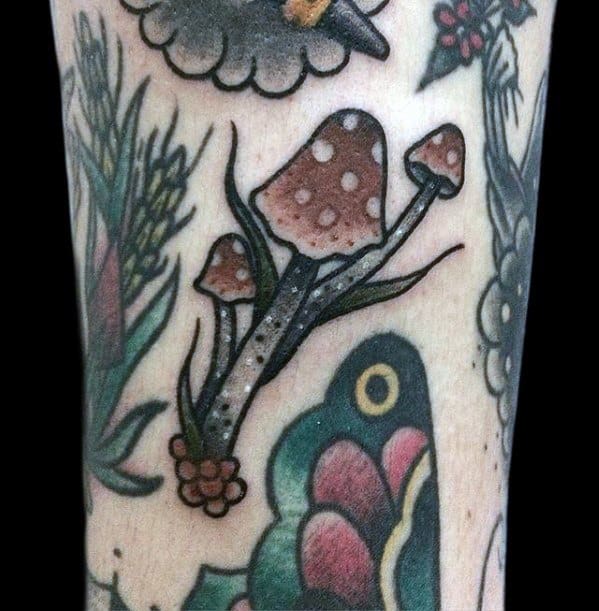 While the largest organism in the world is a mushroom, your mushroom tattoo doesn’t have to follow suit. Without branding yourself as the funnest guy in the room, incorporate a few small mushrooms into a larger sleeve like the fourth traditional mushroom tattoo.