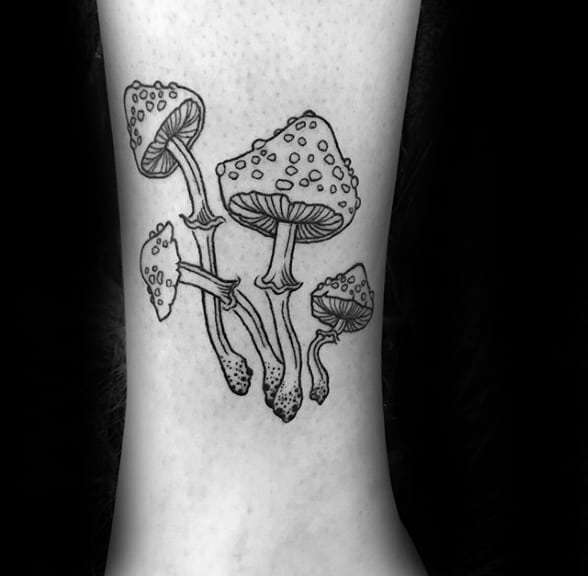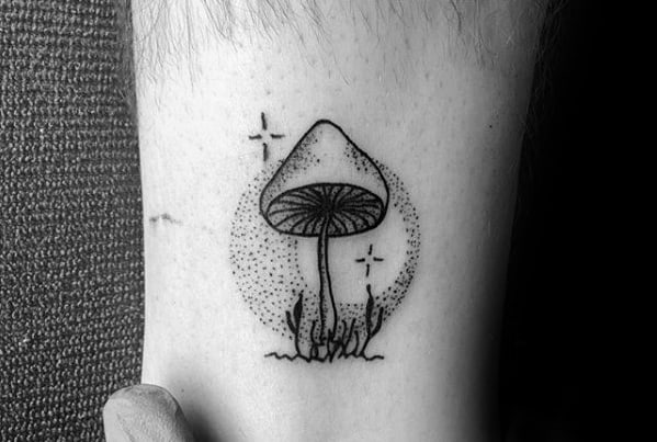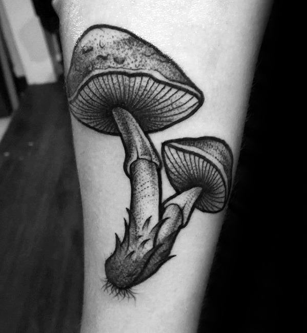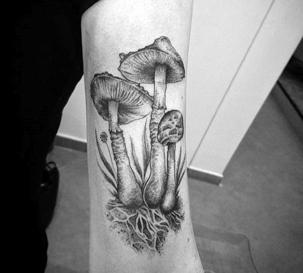 Dotwork can be used to compose a majority of the mushroom tattoo like in the third piece, which uses only a singular line to distinguish the cap of the mushroom. Or utilize dotwork as shading like the fourth piece, with strong linework delineating the outline of the mushrooms and surrounding vegetation.