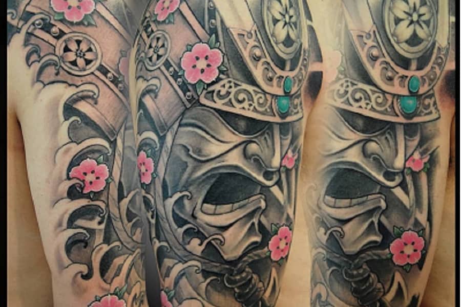 Colorful upper arm tattoo featuring a fierce red samurai mask adorned with golden armor details and a vibrant blue lotus flower