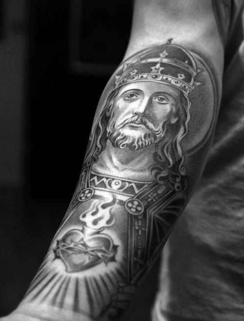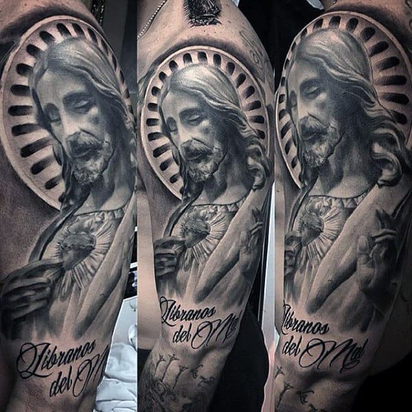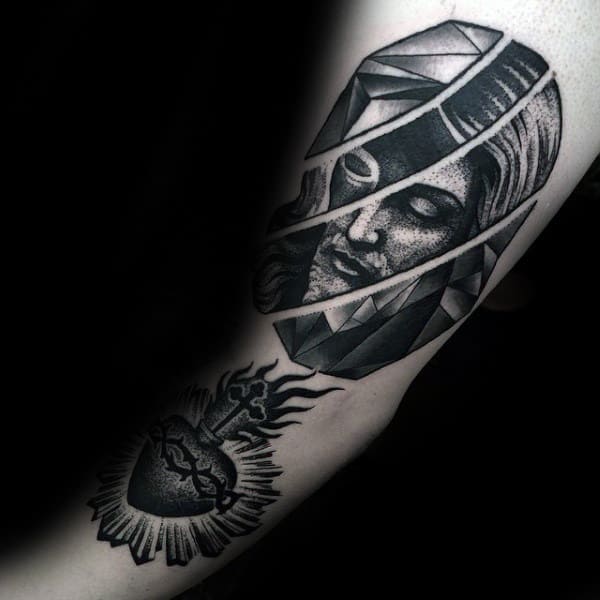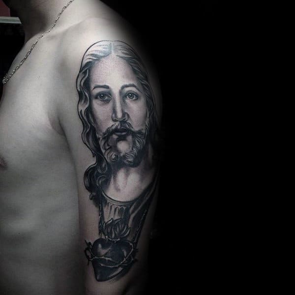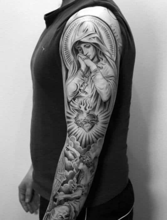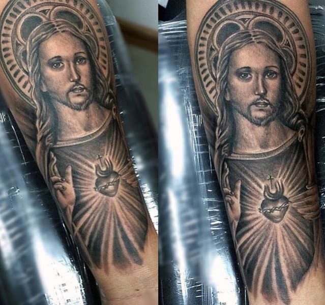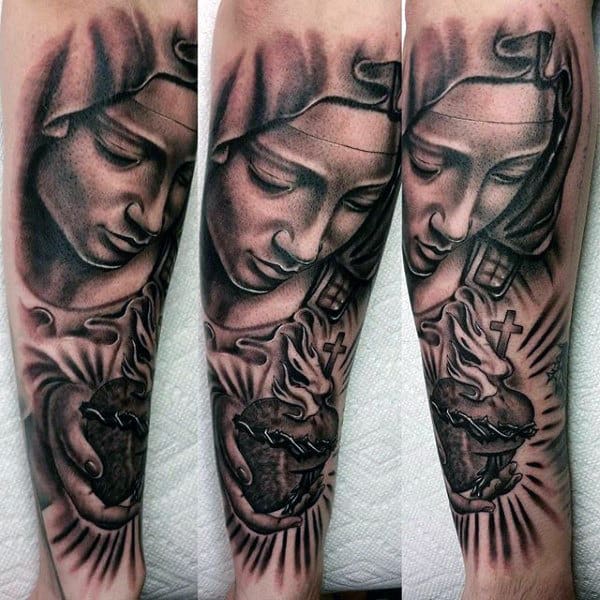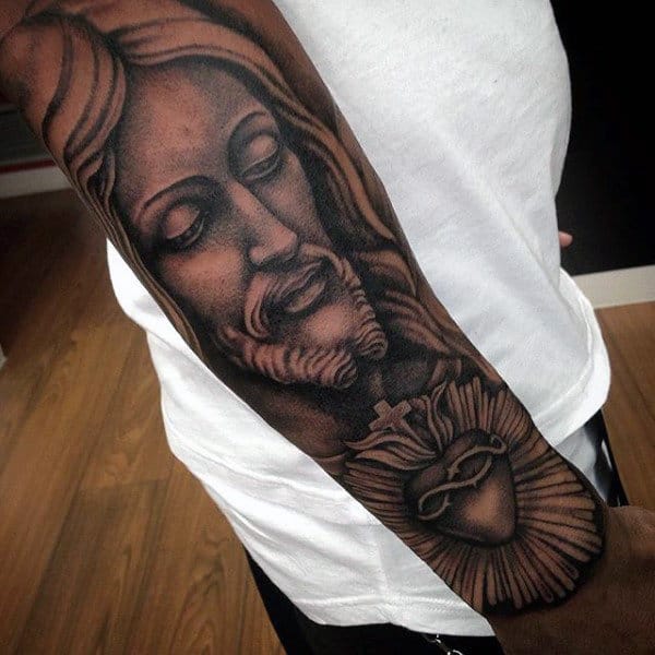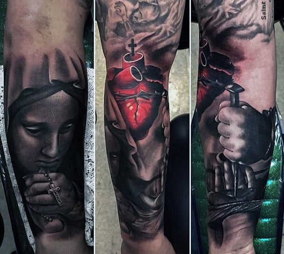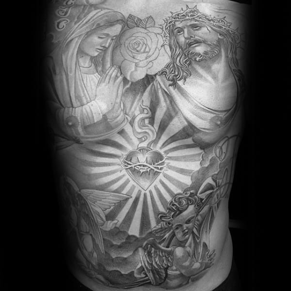 The sacred heart need not standalone as a tattoo. If you have enough canvass and the will to use it then additional religious imagery is a winning choice. In particular, realistic portraits of Jesus or Mary as depicted in countless religious paintings around the world.