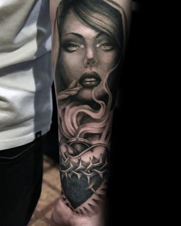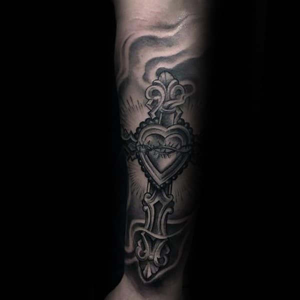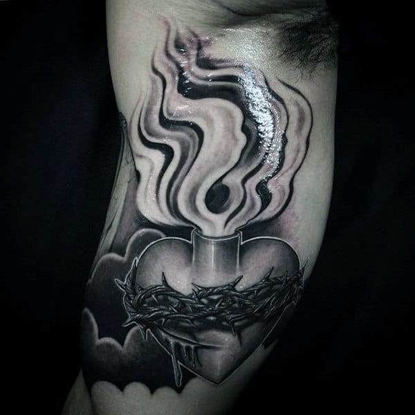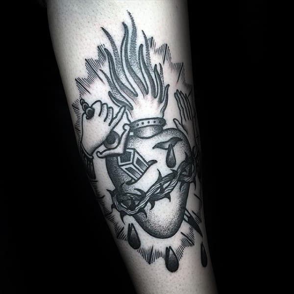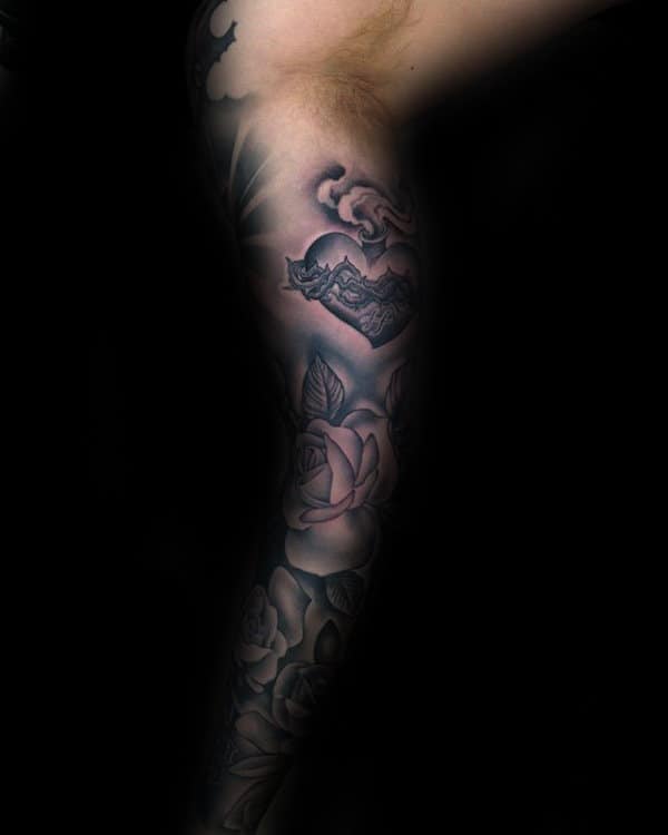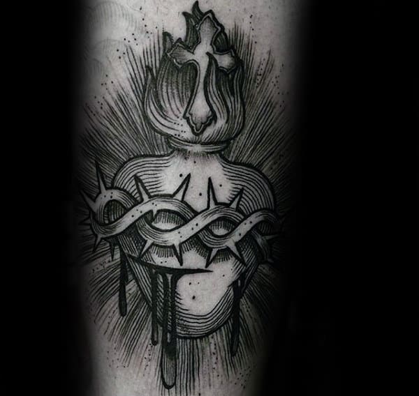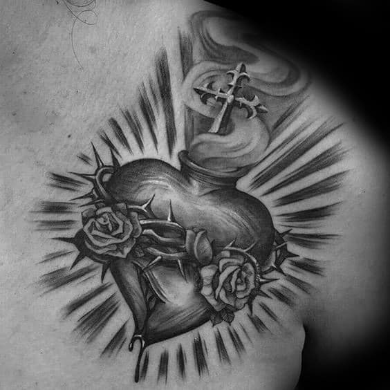 The traditional sacred heart includes some form of the following: flames or smoke, rays of light, thorns and the cross. Tattoo wise it is almost always depicted in black and grey. Black and gray is awesome for achieving depth. Just like in film it brings a solemnity to the work.