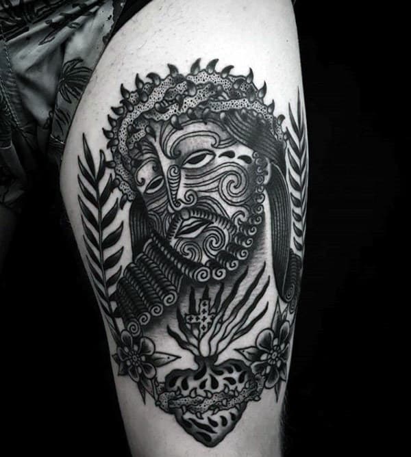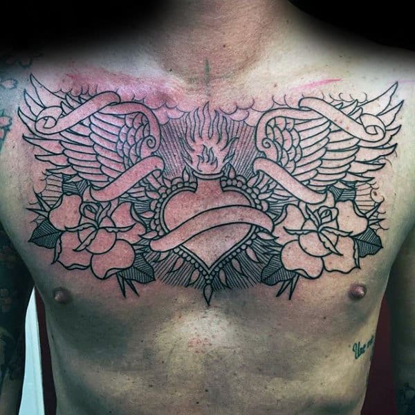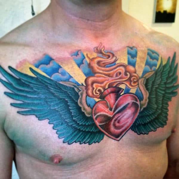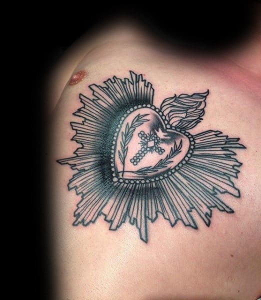 Wings are a common frame but for mine you can’t beat the rays of light beaming out of the heart to the outer edges of the chest. Due to the sheer size though the world’s your oyster. There’s no limit on what you can achieve here. Color, portraits, minimalist but large. It’s all on offer with a sacred heart chest tattoo.