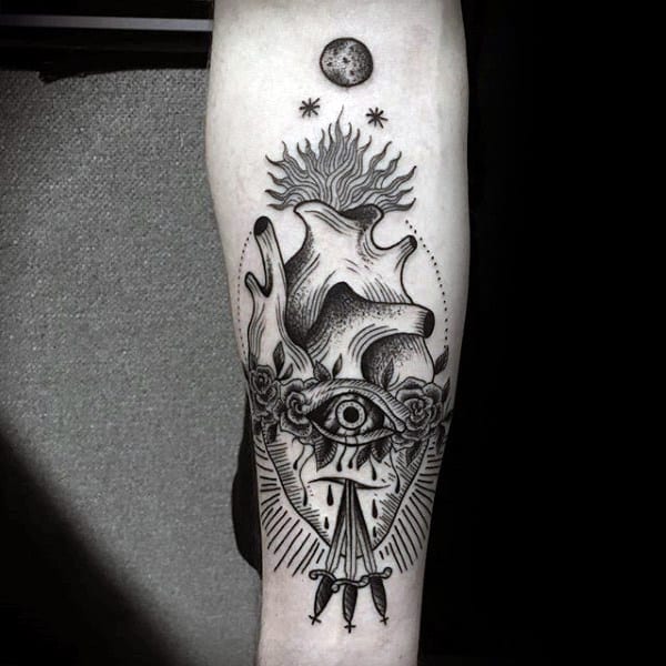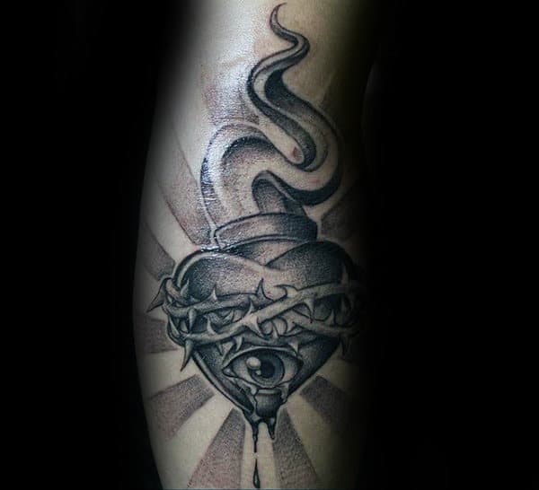 The all–seeing eye sitting within the sacred heart symbolizes the love of God watching over us. It’s a reassuring and comforting reminder that just like the shepherd, He is always watching over His flock. Usually depicted realistically in black and gray, the gazing eye can have a powerful effect on its viewer. It’s a particularly nice contrast with the traditional sacred heart symbol, which is not as realistic in style. If you want your piece to be bold and attention grabbing the all seeing eye is a must.
