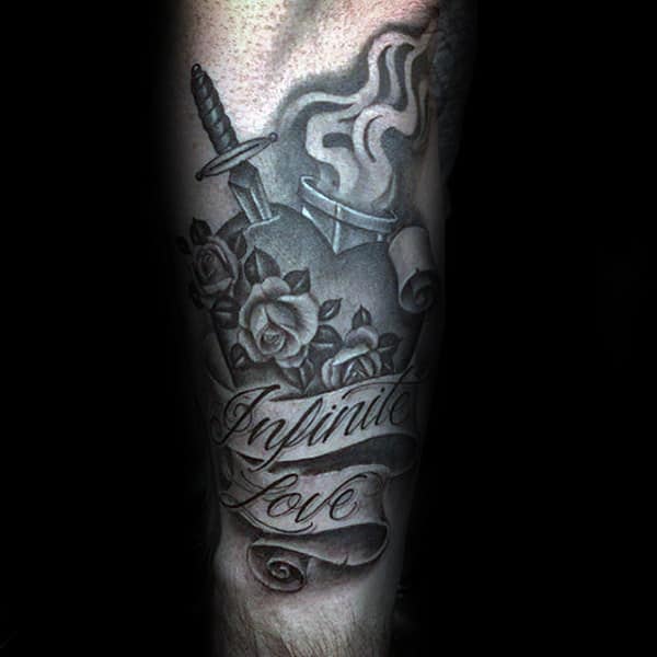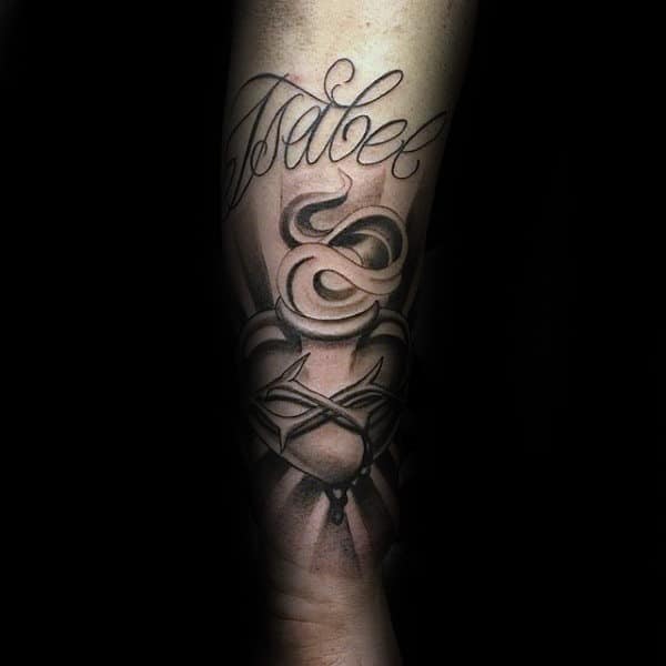 Quotes are always popular and in this case something religious will add oomph. Psalm 147:3 is a classic: “He heals the wounds of every shattered heart.” I also like the Hebrew script as it’s visually appealing. This is excellent to use for simple phrases like “everlasting love,” and will add depth to your sacred heart tattoo.