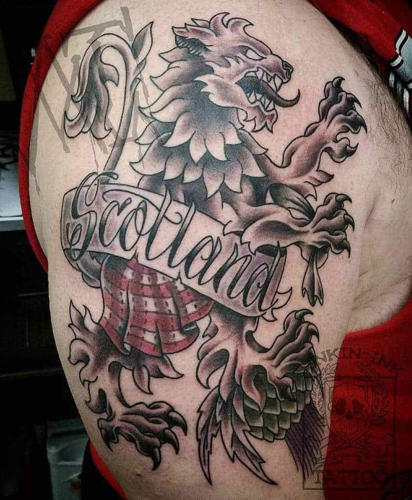 Proudly displayed on the Royal Banner of Scotland, a red lion with blue tongue and claws, rearing on its hind legs is a powerful symbol of Scottish national pride. The tattoos in this gallery take a variety of different approaches to this fierce symbol, but each tattoo artist ensures that everyone who sees these Scottish designs will make no mistakes about the wearer’s country of origin. One stand out piece even has the lion wearing Scotland’s unique national garb, the kilt.