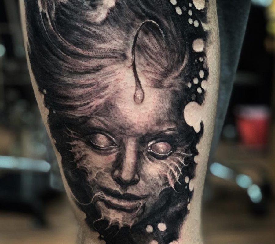 Dark, surreal leg tattoo of a siren's haunting face, surrounded by flowing hair and abstract underwater elements