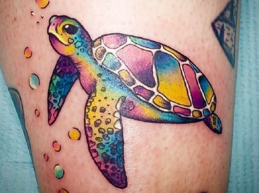 Colorful sea turtle tattoo with bubbles on skin