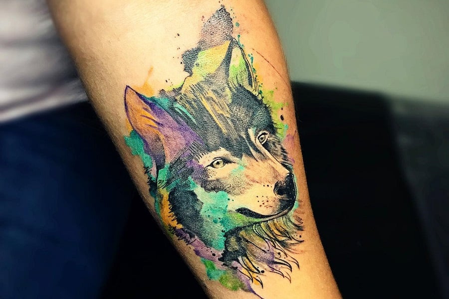 A vibrant watercolor-style wolf tattoo gracefully adorns a person's forearm