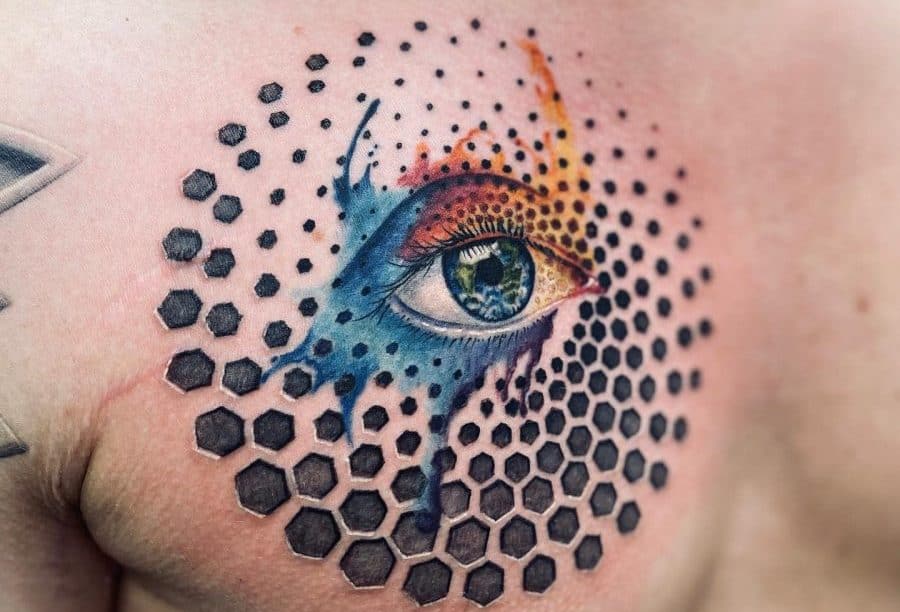 Chest tattoo featuring a realistic eye with watercolor splashes and hexagonal patterns, blending surrealism with geometric elements.