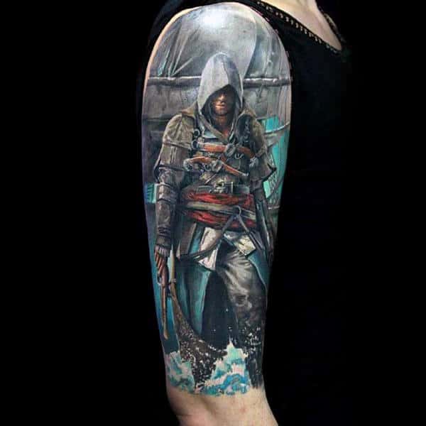 Half Sleeve Assassins Creed Gamer Mens Tatoo Designs