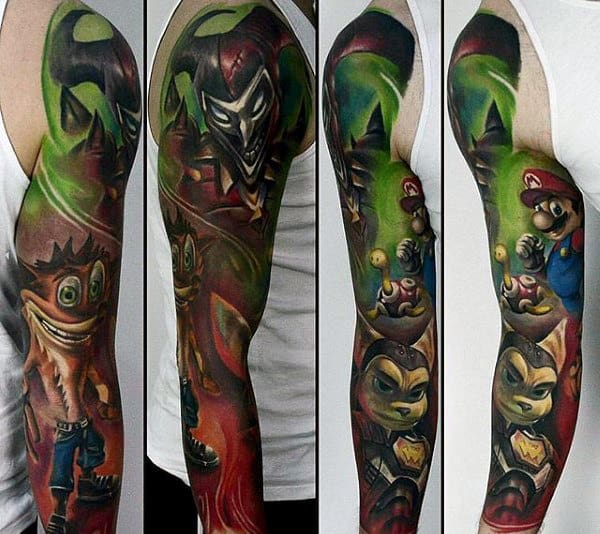 Full Arm Sleeve Gamer Tattoo Ideas On Guys