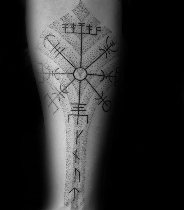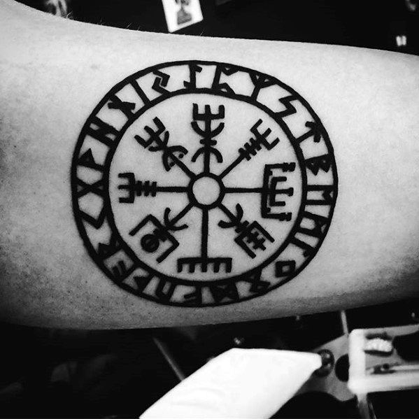 writing was composed of symbols called , which are also the shapes you see extending from the spokes of a . were very simple letters, composed almost entirely of straight lines. For this reason, sharp and crisp linework often makes the best . While these tattoos may look simplistic at first, they’re the most faithful recreations of the runic alphabet.